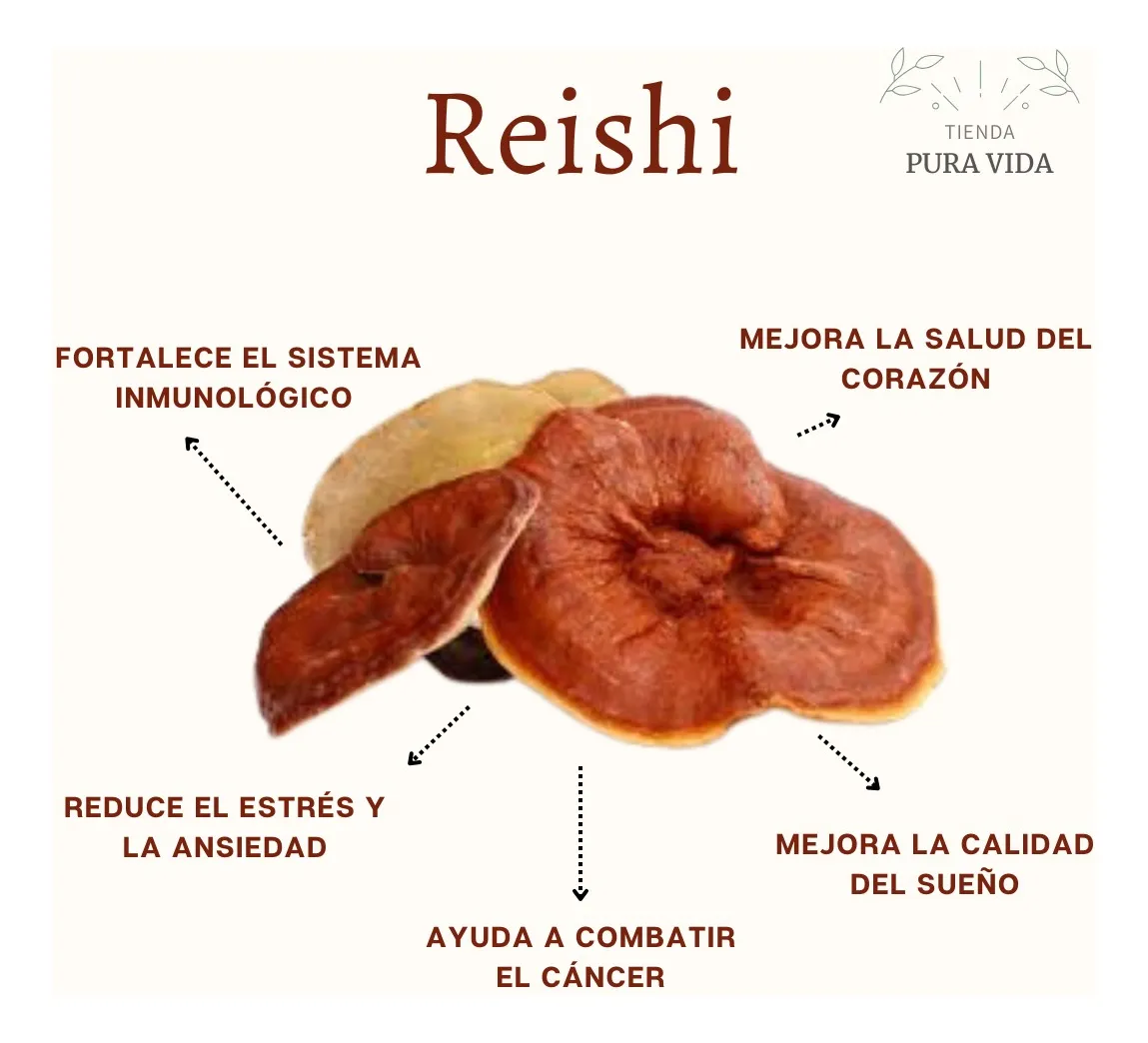 El Hongo Medicinal Reishi, mantiene el sistema inmune bajo control e incluso puede luchar contra las células cancerosas. Gracias a sus propiedades de triterpeno, aumenta nuestro estado de ánimo, pueden aliviar la ansiedad, aliviar la depresión y fomentar la paz.